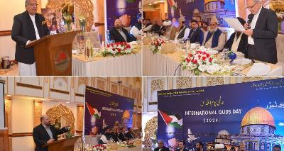 The Iranian Embassy in Pakistan has organized World Quds Day, a day dedicated to showing solidarity with the Palestinian people and their struggle against Israeli occupation. “We all know very well that 75 years ago, an anti-Islamic and anti-human project called “Zionism” was launched by global arrogance with the aim of de-Islamizing the Holy Land of Palestine,” said Reza Amiri Moghadam, the Iranian Ambassador to Pakistan, while Addressing the event.Defense Minister Khawaja Asif, Federal Minister for Housing and Works Riaz Hussain Pirzada, Senator Raja Zafar ul Haq, Allama Raja Nisr Abbas,Chairman Majlis e Wahdat ul Muslimeen, Allama Sajid Naqvi, Mr.Tahir Ashrafi and many other notables also attended the event.